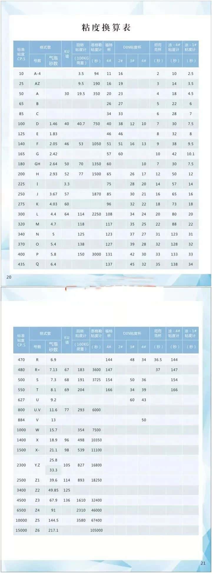 涂-4杯黏度,单位m2/s,=(T4-6.0)/0.223,T4为涂4杯测得流体流出时间s;不同黏度测定方法所得试验数据也可通过表格进行换算。(如下图)